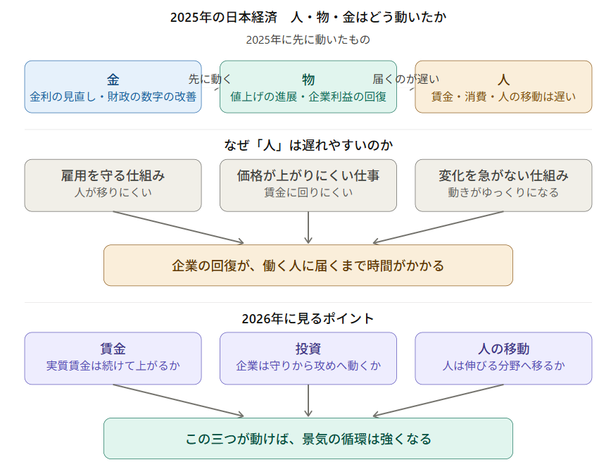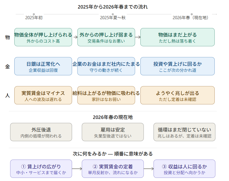 2025年から2026年春にかけた「物・金・人」の流れと、今後の観測点をまとめた全体整理図を先に置くのも、そのためである。