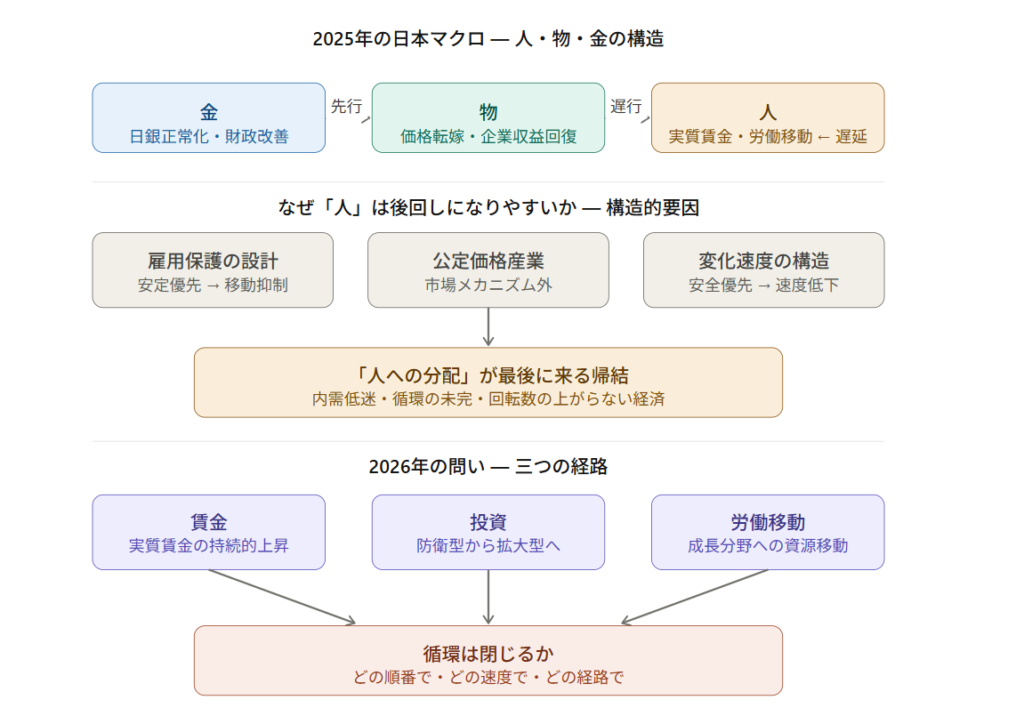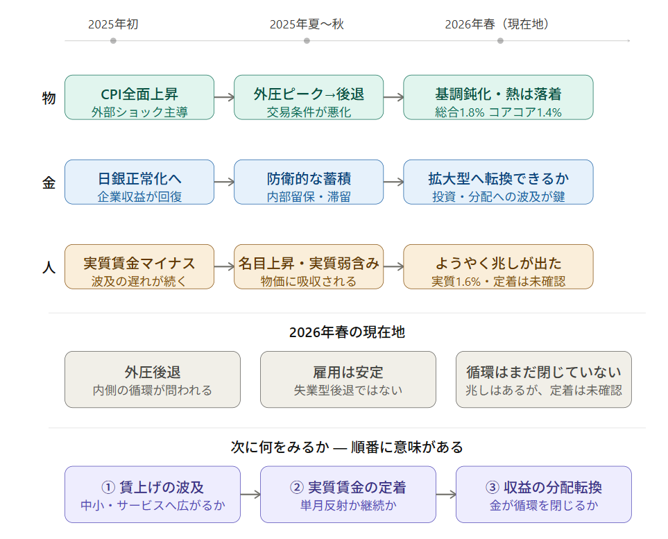 2025年から2026年春にかけた「物・金・人」の流れと、今後の観測点をまとめた全体整理図。
