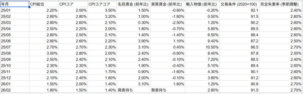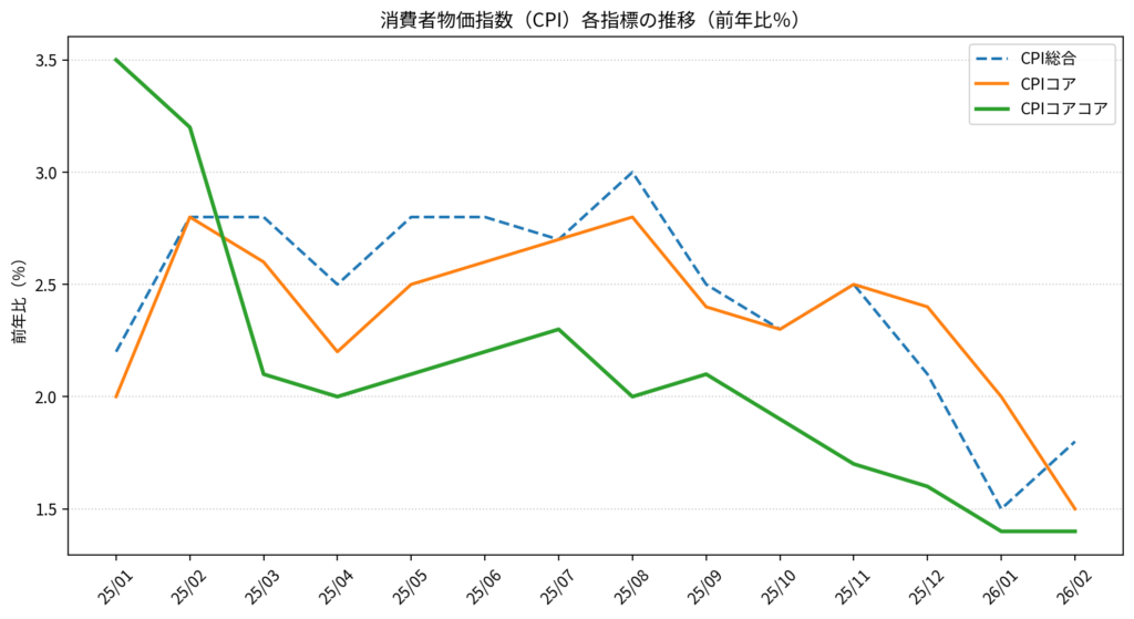 2026年2月時点では、総合1.8%、コア1.5%、コアコア1.4%である。