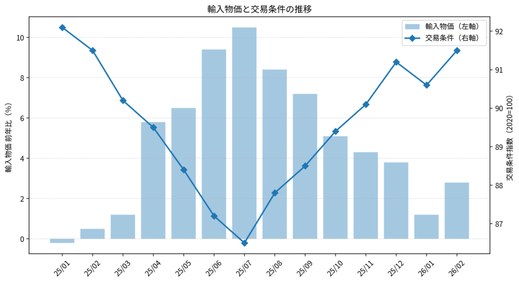 また、現在の物価動向をなお外部ショック中心に読むべきか、それとも内側の循環の問題として読むべき段階に移っているのかを確かめるため、輸入物価と交易条件もあわせてみる。