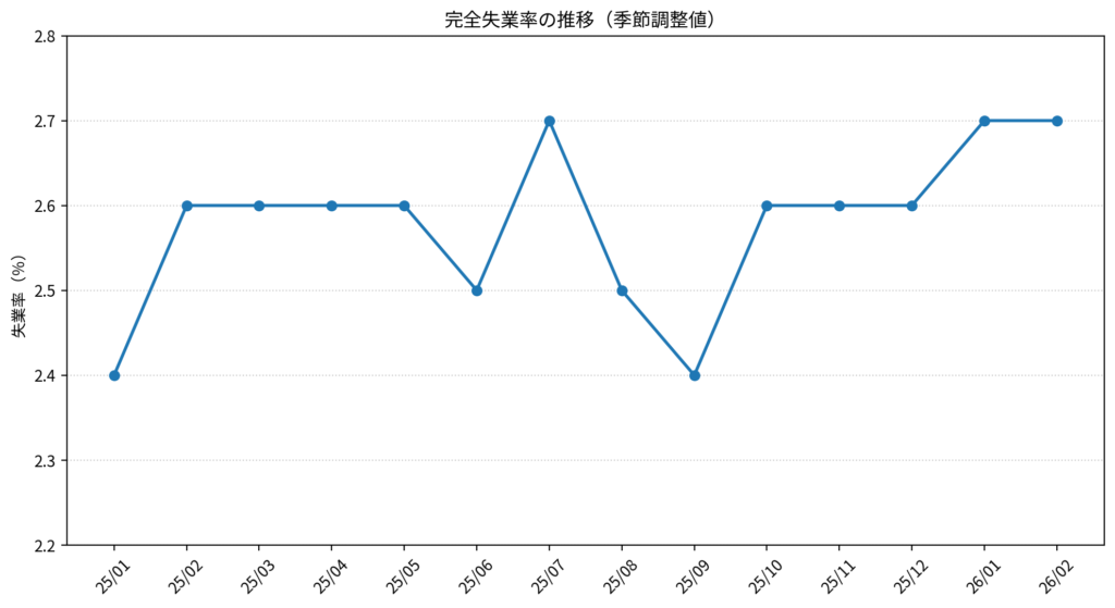 完全失業率も参照するが、これは主役ではない。雇用環境が崩れていないことを確認するための補助的な指標として扱う。