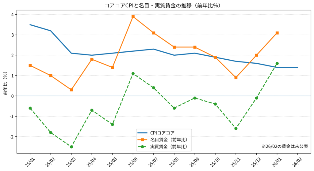 名目賃金は2025年を通じて振れを伴いながら推移したが、2026年1月には3.1%まで持ち直している。